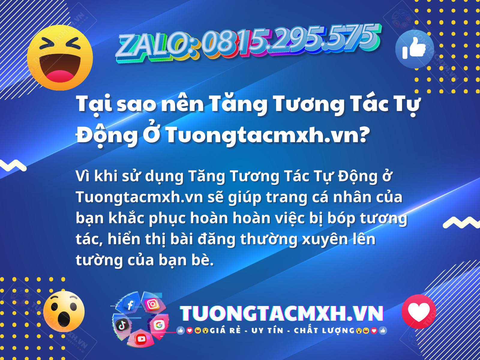 Bạn có từng nghĩ tại sao mình lại sử dụng auto tương tác bạn bè và nó sẽ có tác dụng gì đối với trang cá nhân của bạn? Mạng xã hội Facebook với hàng tỷ người dùng hiện nay và mỗi ngày bạn có thể làm hàng trăm thứ với mxh này. Bạn muốn trang cá nhân của mình được nhiều người theo dõi hơn, những bài mà bạn post được nhiều sự quan tâm hơn. Và bạn không đủ khả năng làm điều đó, vậy tại sao không thử đến với bot auto tương tác của Tuongtacmxh.vn để được trải nghiệm một bot auto thả tim, like bài viết, tự động comment… ngay hôm nay nào.