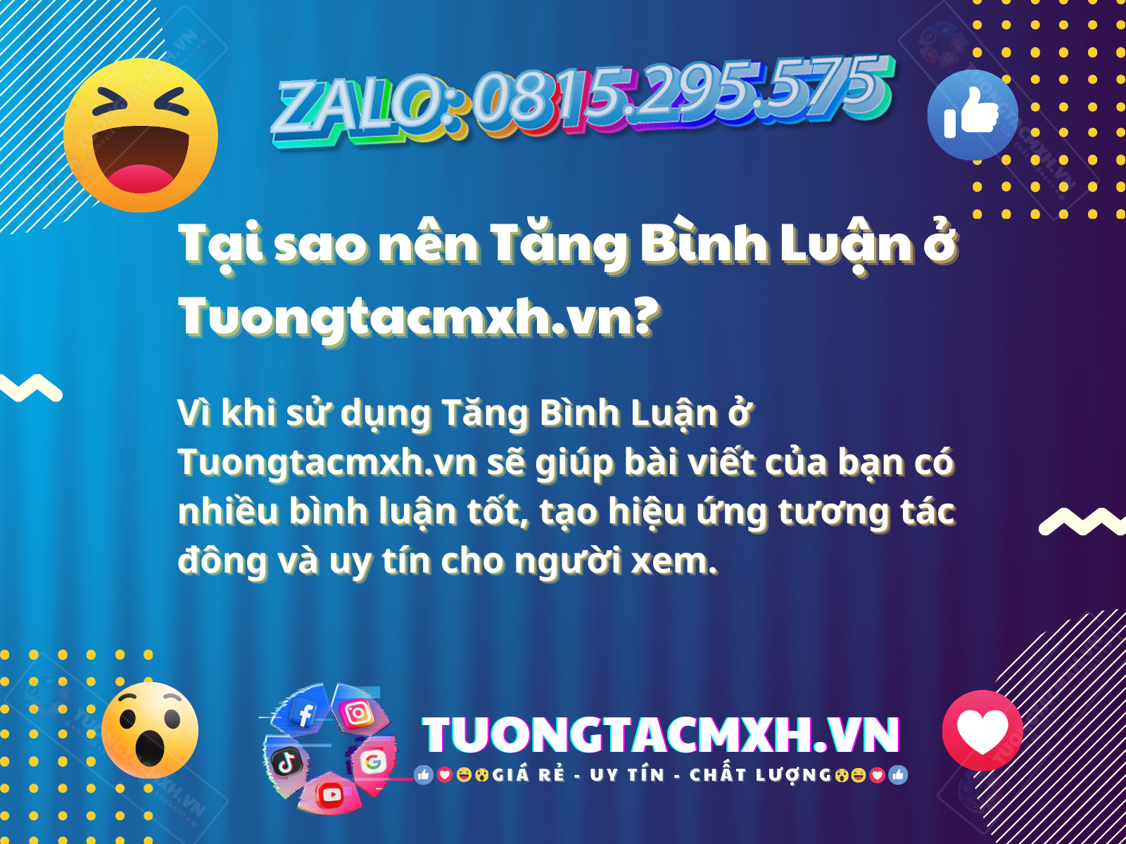 Dịch vụ tăng bình luận facebook sẽ xây dựng nền tảng thương hiệu cho bạn và hơn nữa kiếm được nhiều khách hàng hơn, tạo sự tin tưởng sẽ đạt được mục tiêu của mình. Thế nên hiện nay rất nhiều hệ thống cung cấp dịch vụ này, tăng bình luận trên trên facebook. Tùy theo yêu cầu và mục đích của bạn thì hệ thống Tuongtacmxh.vn của chúng tôi sẽ mang đến cho bạn được tất cả các bình luận trên bài viết cũng giống như các hình thức tương tác khác trên facebook là tăng like, tăng share.